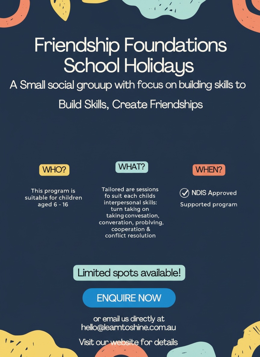 Our Friendship Foundations program is a small group social program focused on helping children aged 6–16 develop essential skills in a supportive and fun environment. It's a great opportunity for them to build confidence, create meaningful friendships, and learn valuable social skills.